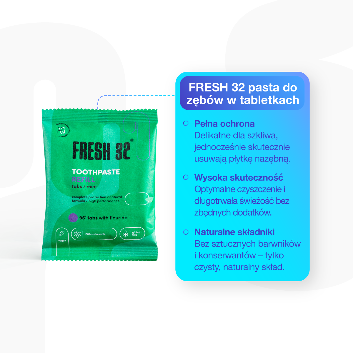 Wystarczy włożyć tabletkę pasty do ust, delikatnie ją przeżuć, a następnie rozpocząć szczotkowanie zębów szczoteczką FRESH 32. Tabletka lekko się spieni, zapewniając dokładne czyszczenie i świeży oddech. Po zakończeniu wypłucz usta jak zwykle.